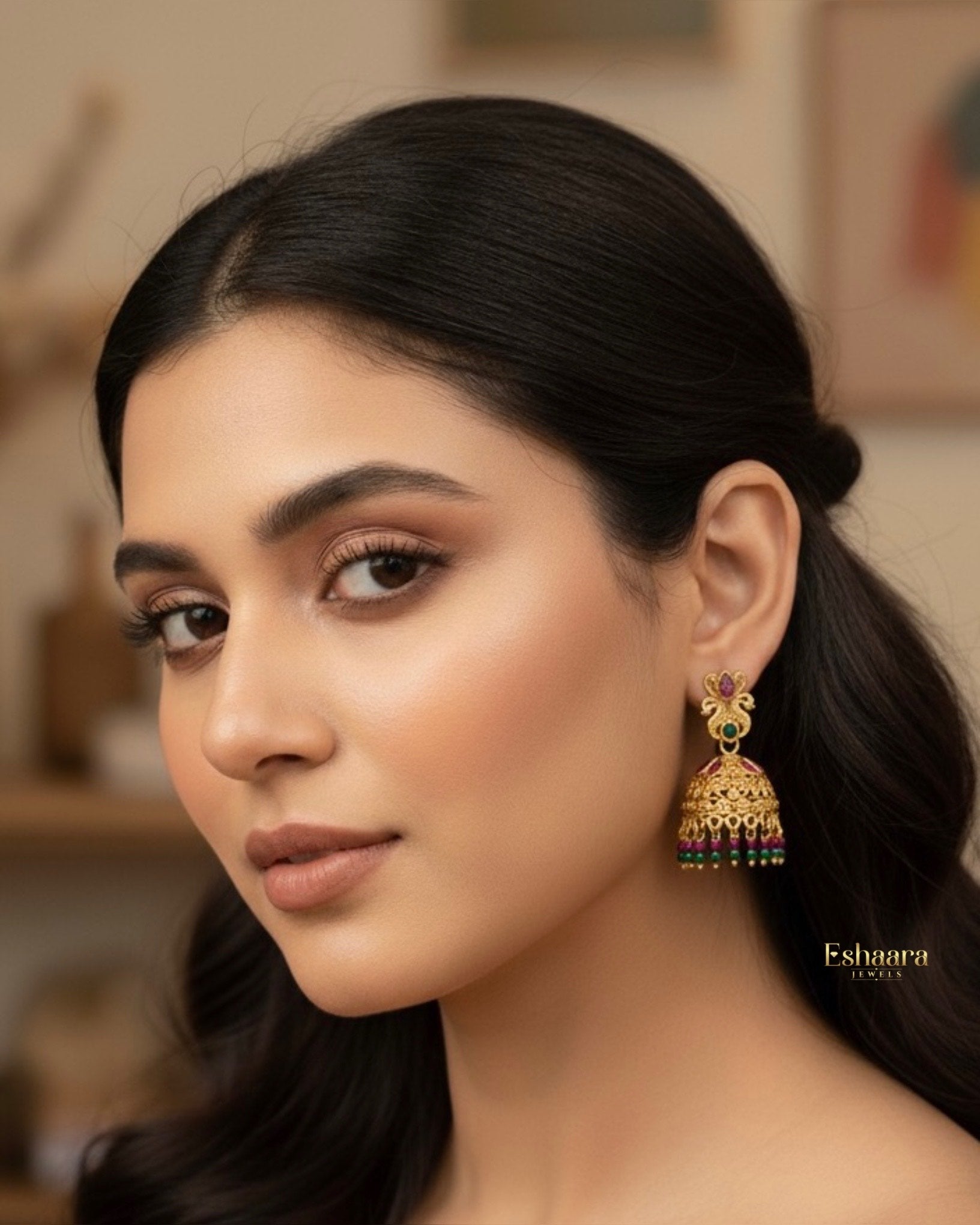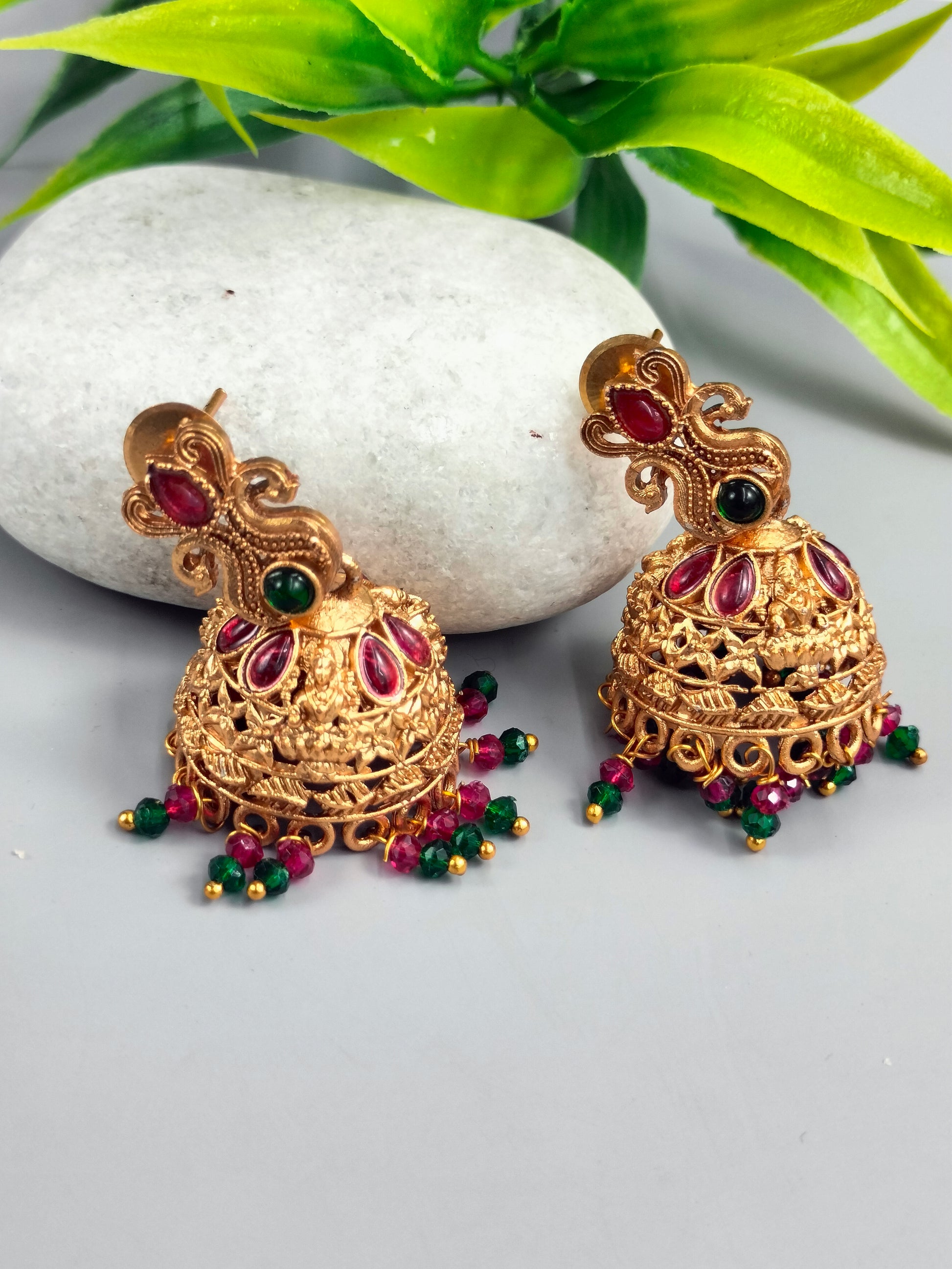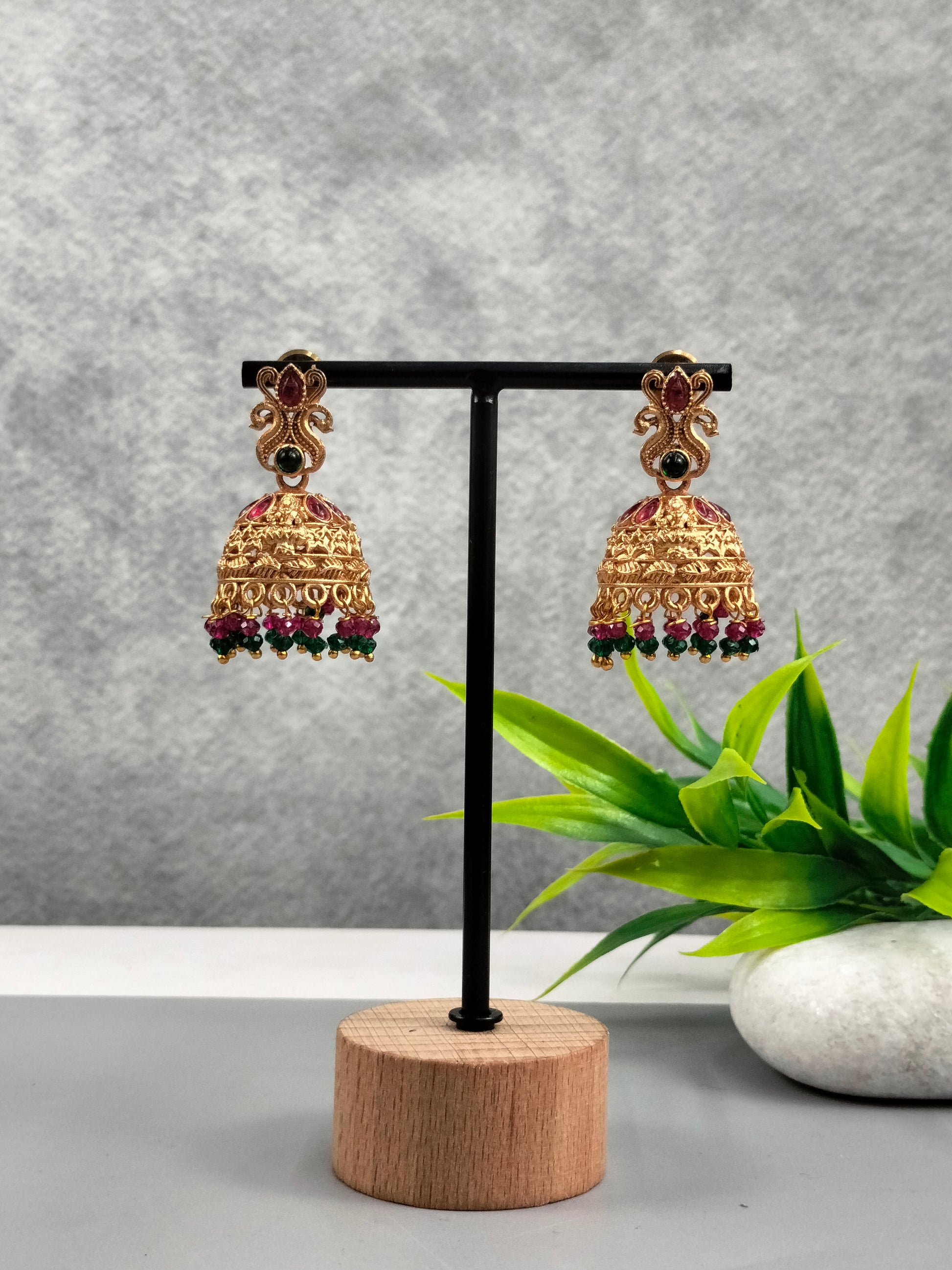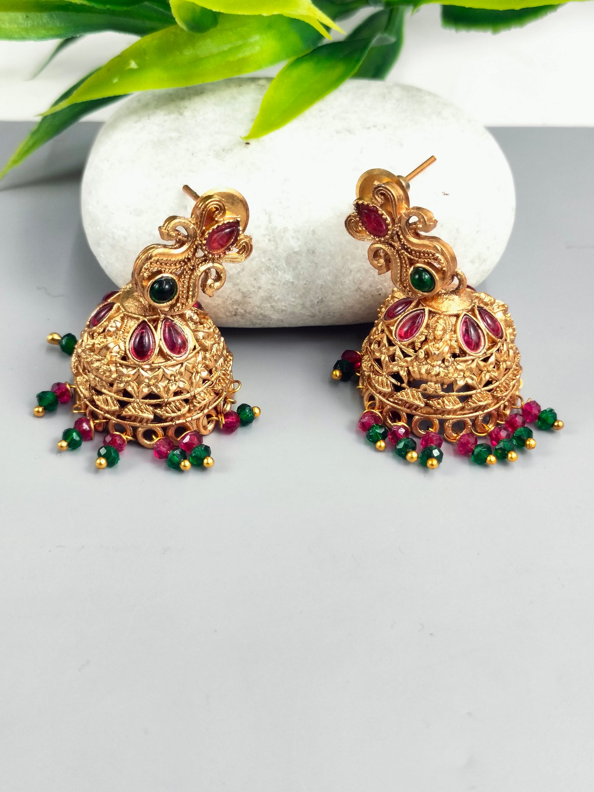 Jhumka is intricately designed with a bell - shaped bottom .The top features a paisley - shaped desing with a red stone at its center , flanked by green stones . The earring is further embellished with hanging red and green beads .