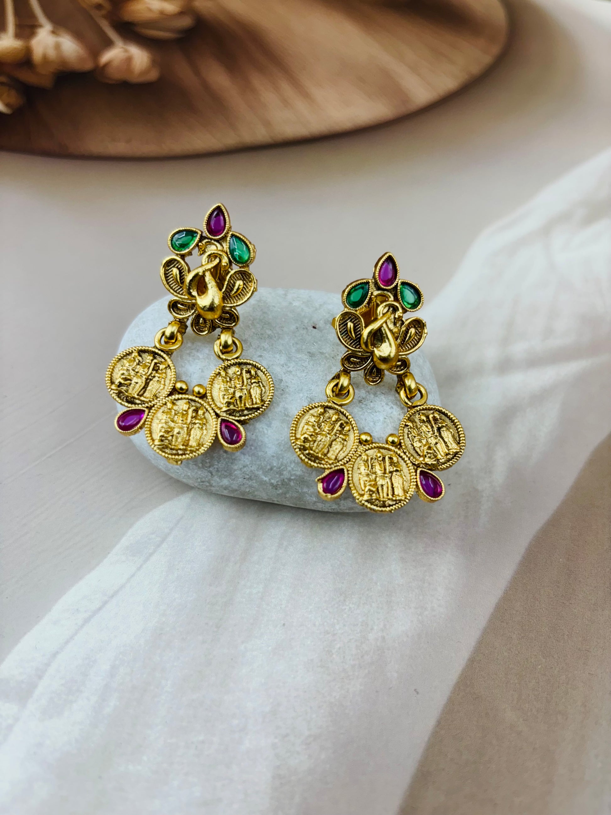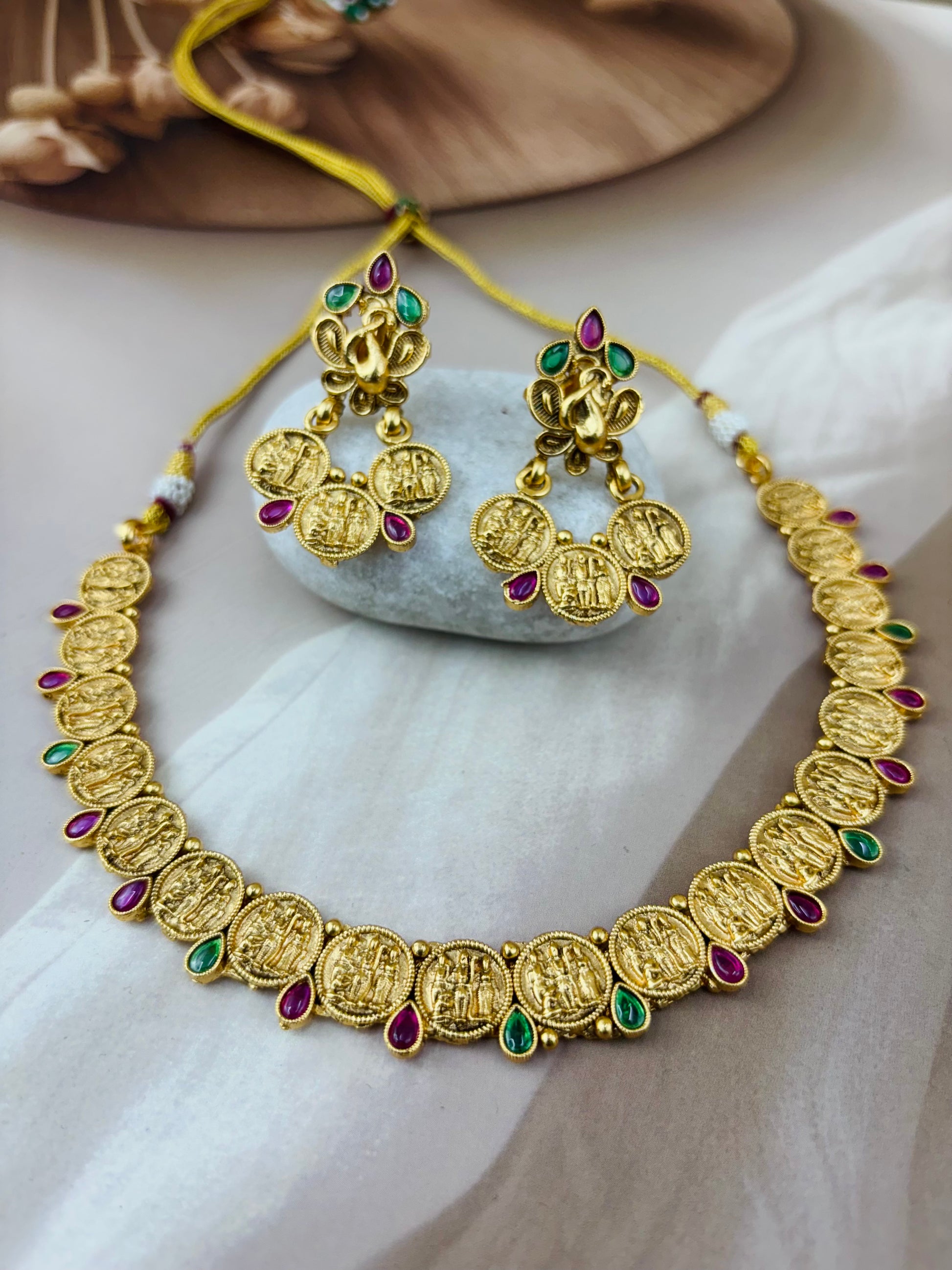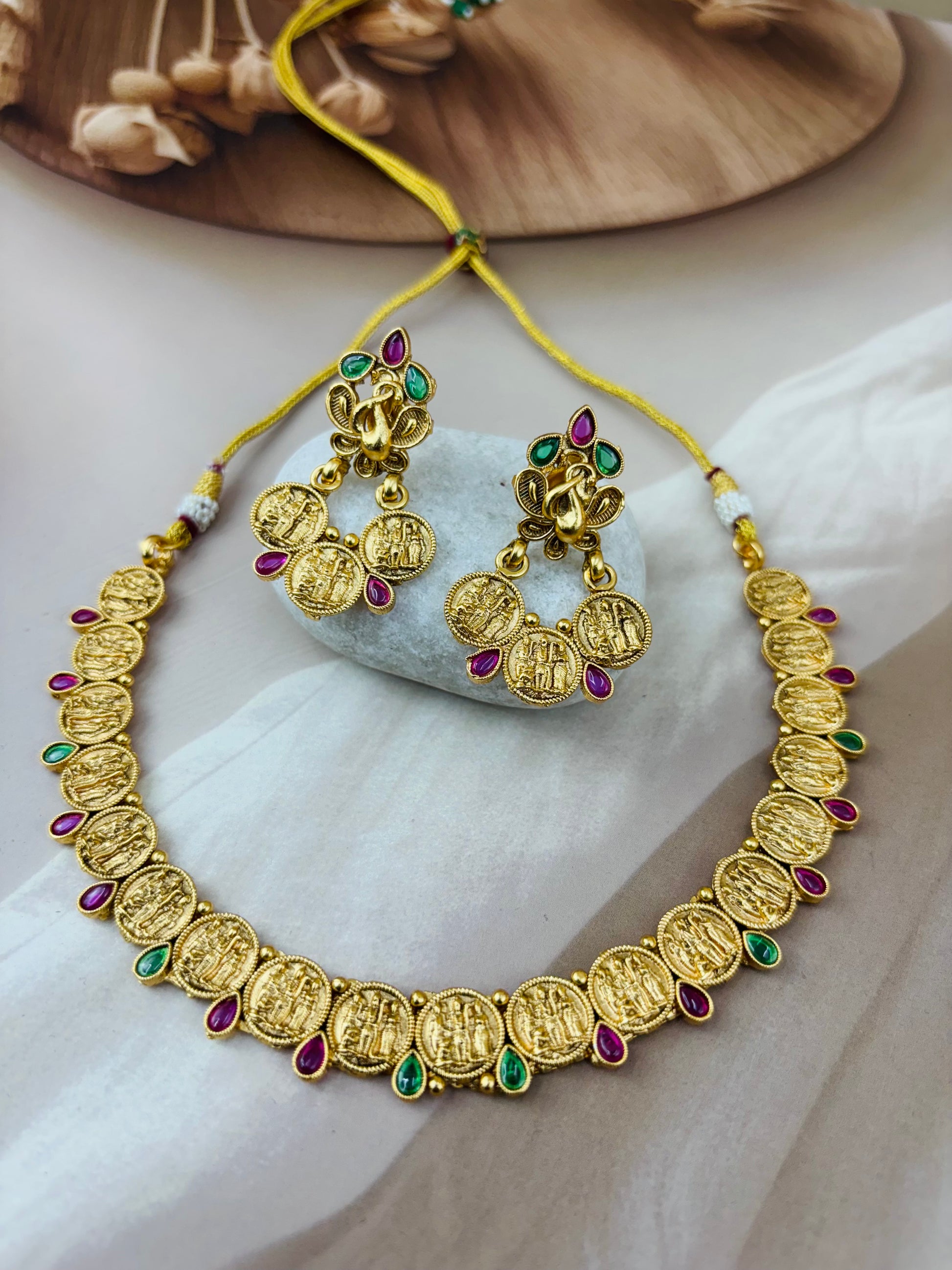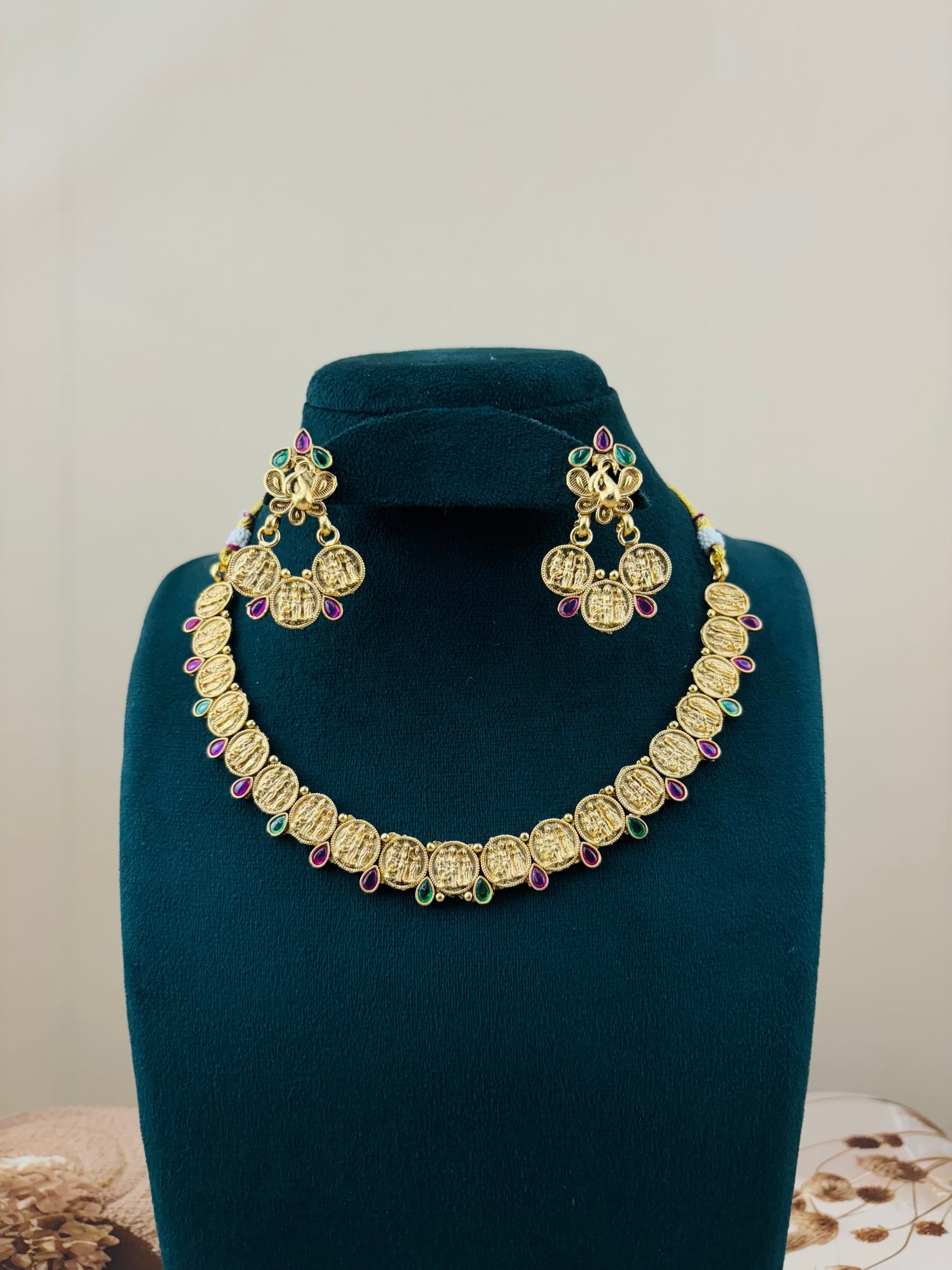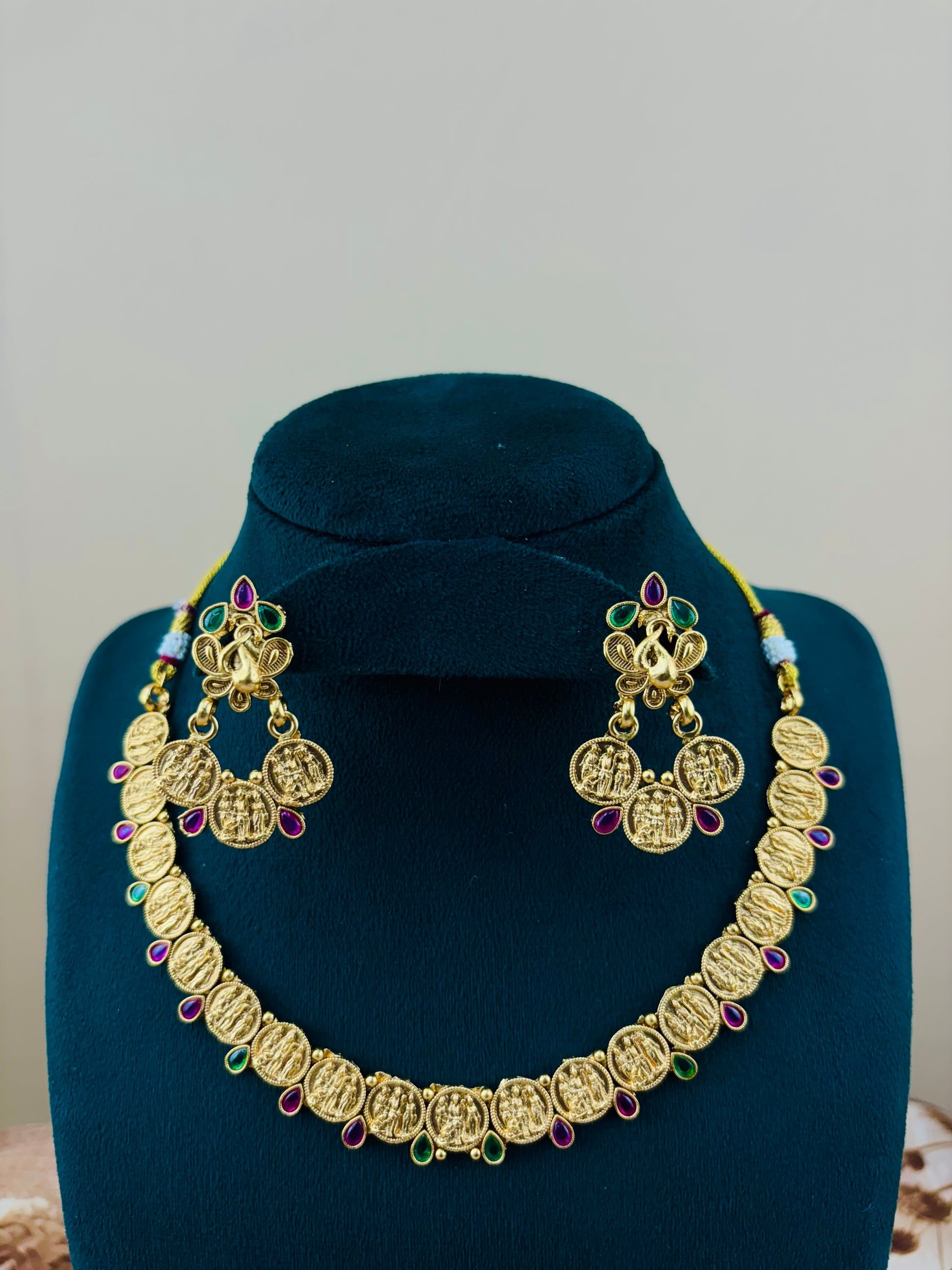 A gold-toned necklace and earrind set featuring intricate coin-like pendants with embossed figures,likely depicting Hindu deities.The pendants are linked together and adorned with alternating red and green gemstones. The matching earrings have a similar coin design with a peacock-shaped top piece,also embellished with gemstones .
