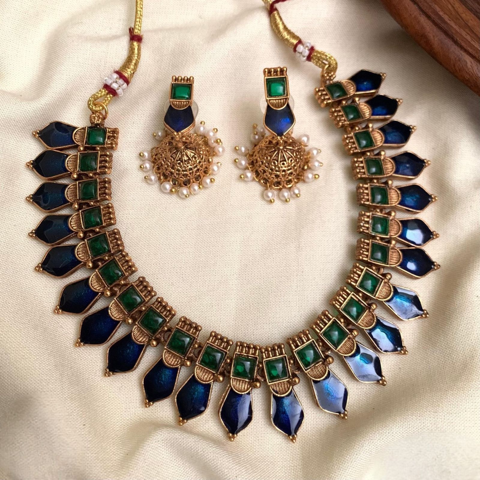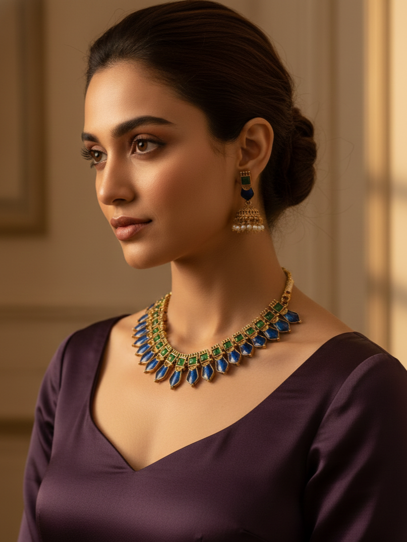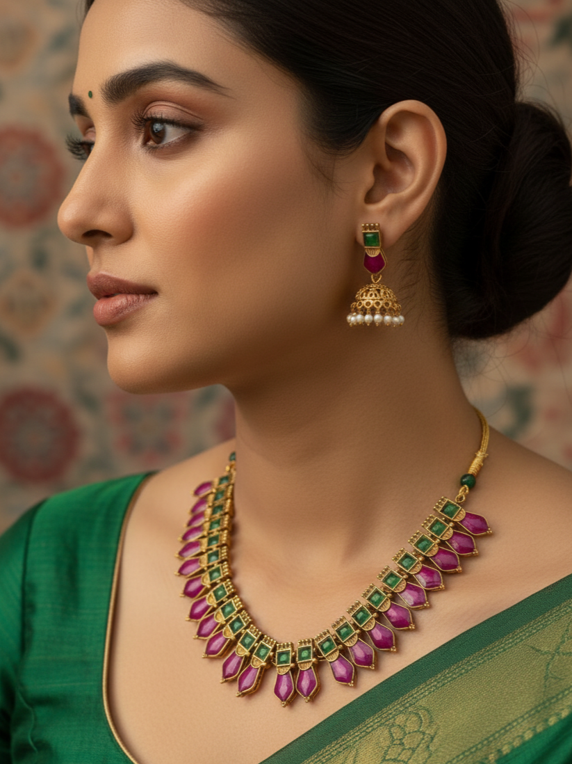 A classic Palakka-style gold necklace featuring leaf-shaped ruby accents paired with emerald-green detailing. Designed with traditional elegance and fine craftsmanship, it is perfect for festive and bridal occasions.