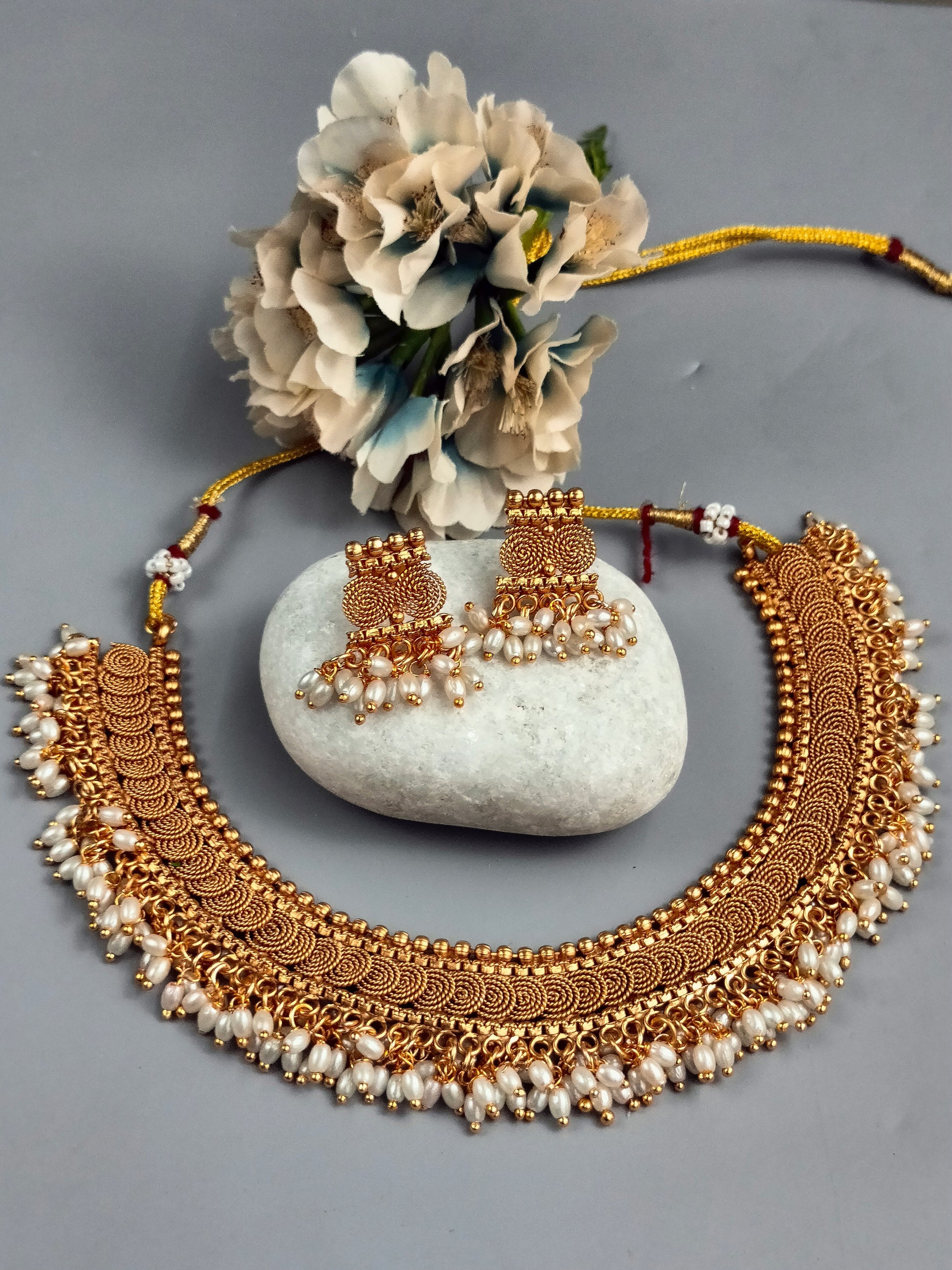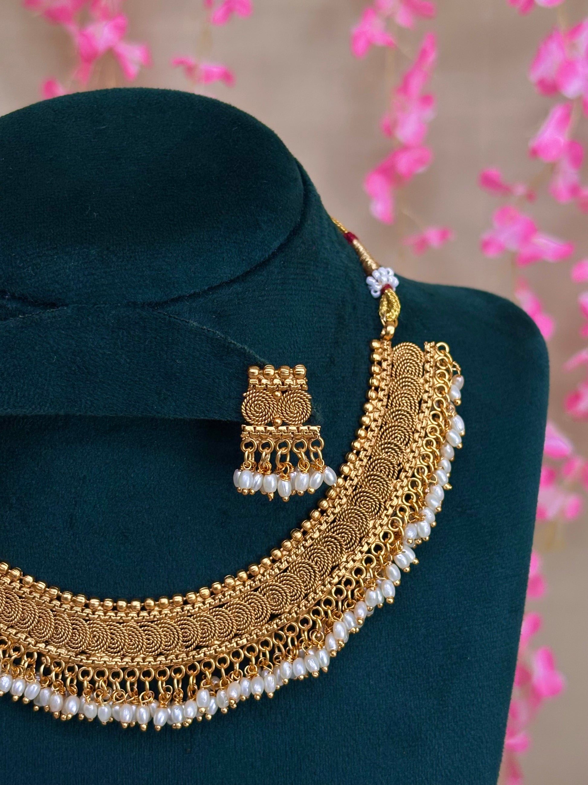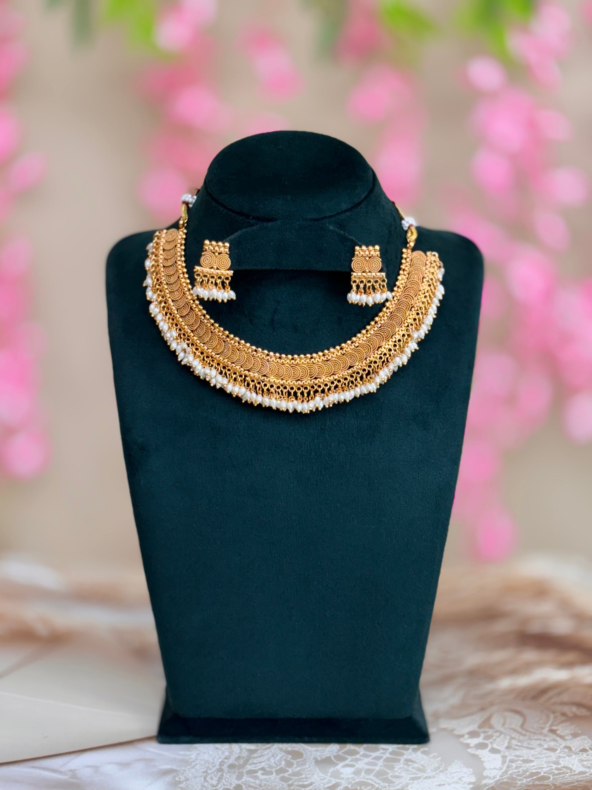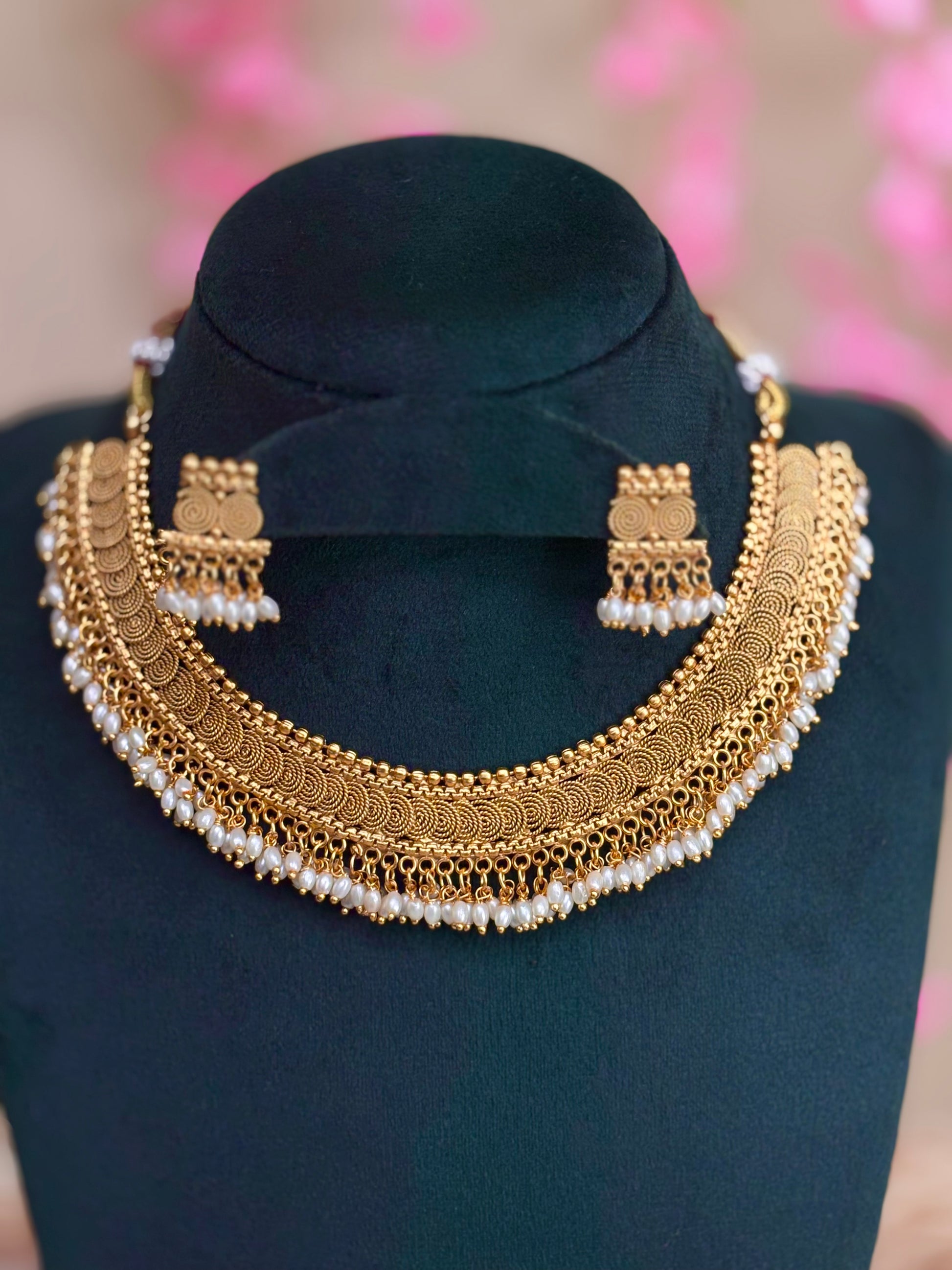 Traditional coin necklace with rice pearls paired with earring