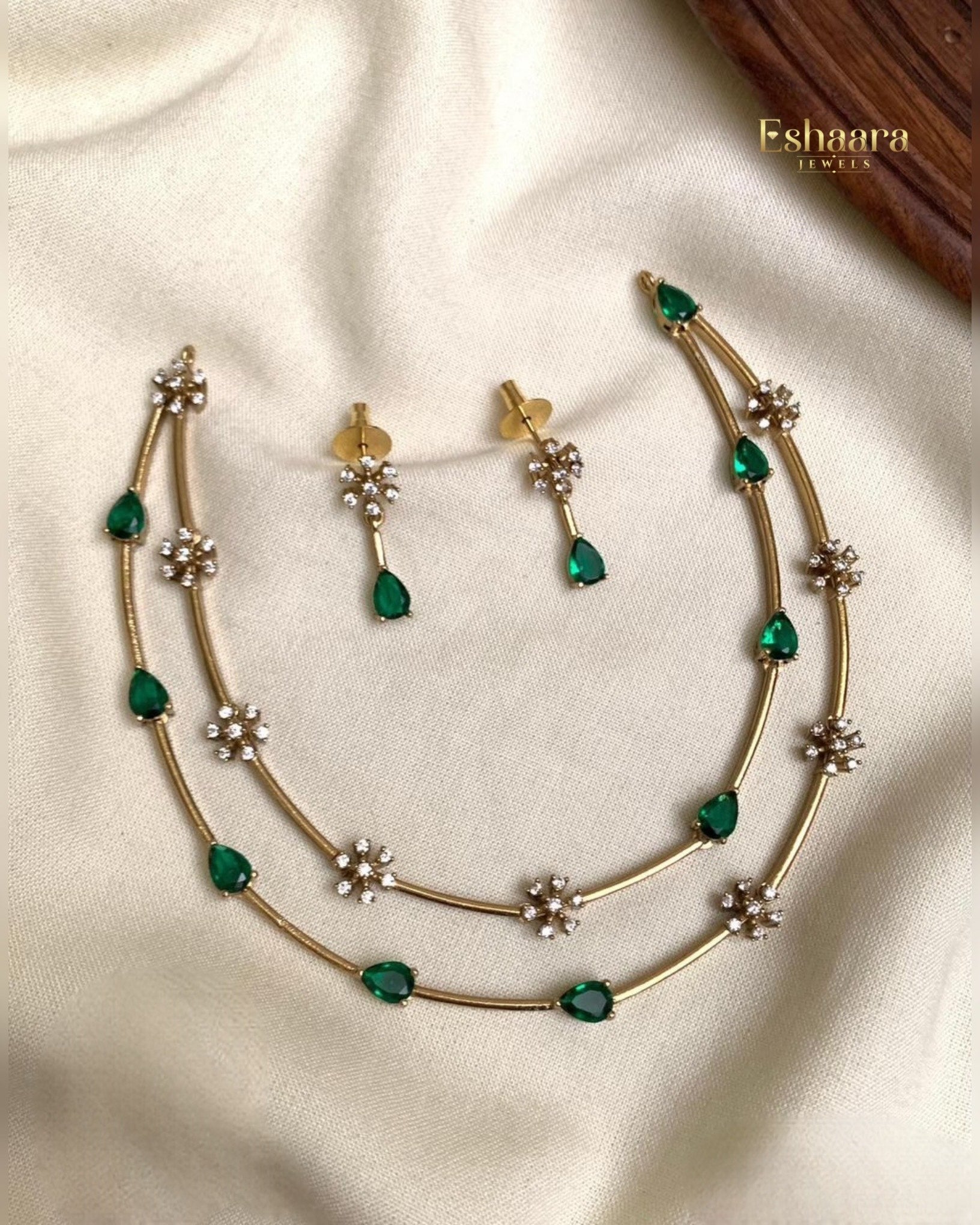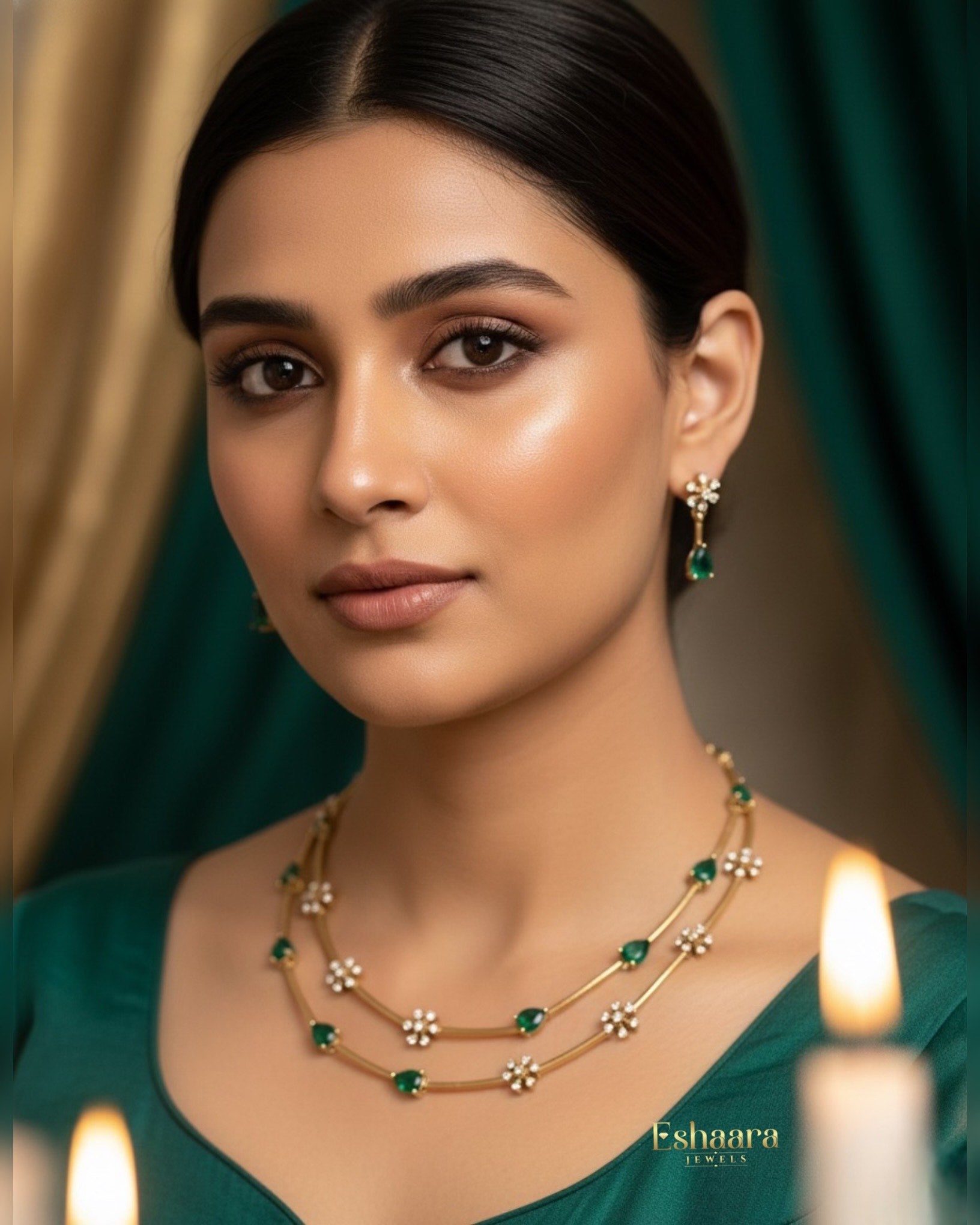 A delicate gold necklace and matching earrings. The design includes teardrop-shaped green gemstones paired with sparkling white stones arranged in floral motifs, creating a refined and sophisticated look.