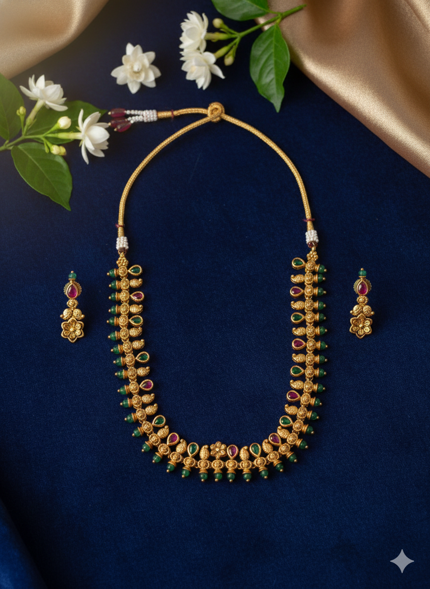 The traditional South Indian-style antique jewelry set is a stunning choker necklace and matching earrings. The necklace features intricate detailing with ornate motifs adorned with emerald green and ruby red stone drops, reflecting a rich heritage design. The golden spiral and floral patterns add an elegant vintage touch, while the dangling green beads enhance its festive appeal. Paired with matching earrings featuring similar detailing and stud-style closures, this set is perfect for weddings, temple events, or cultural celebrations.
